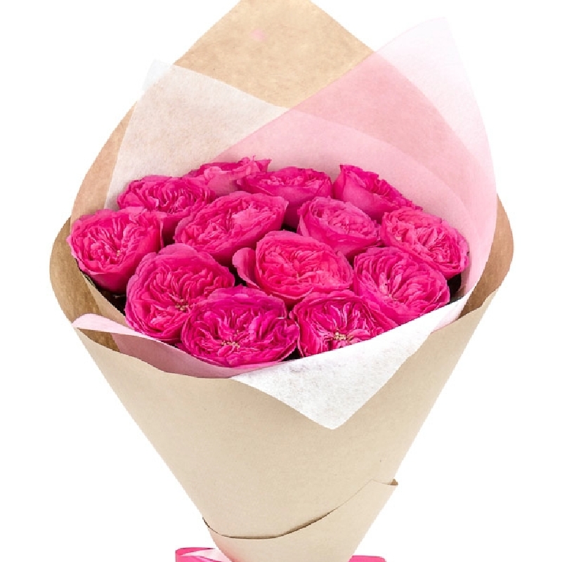 Букет состоит из 13 пионовидных роз, крафт, атласная лента.