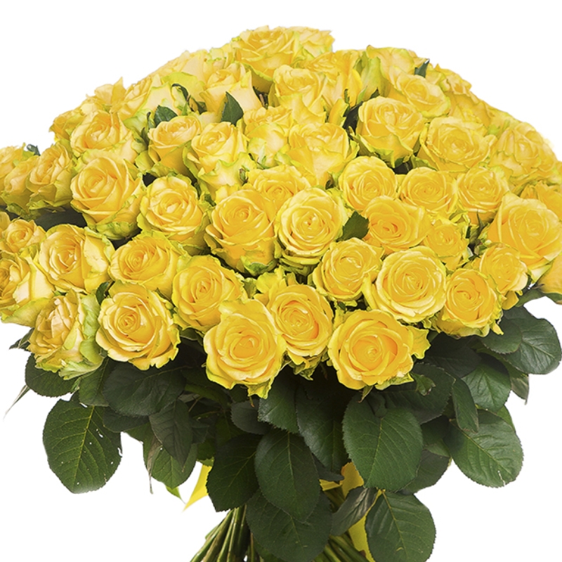 Букет состоит из 55 желтых роз, прозрачная упаковка, желтая лента.