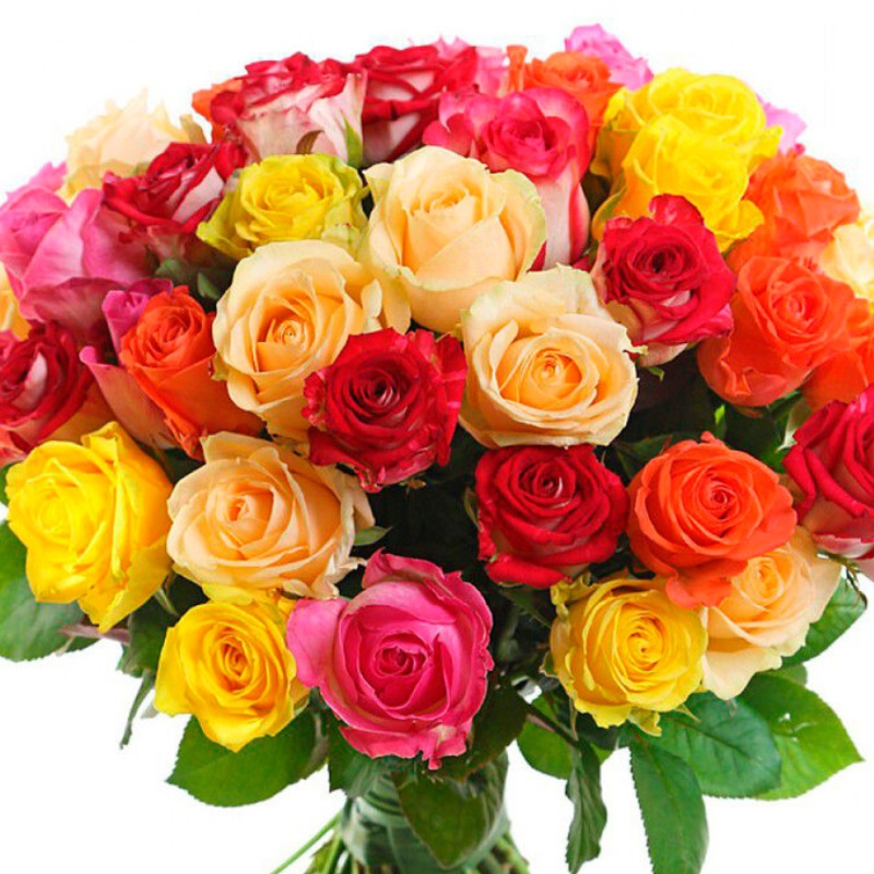 Букет состоит из MIX из 55 роз Кения, прозрачная упаковка, атласная лента.