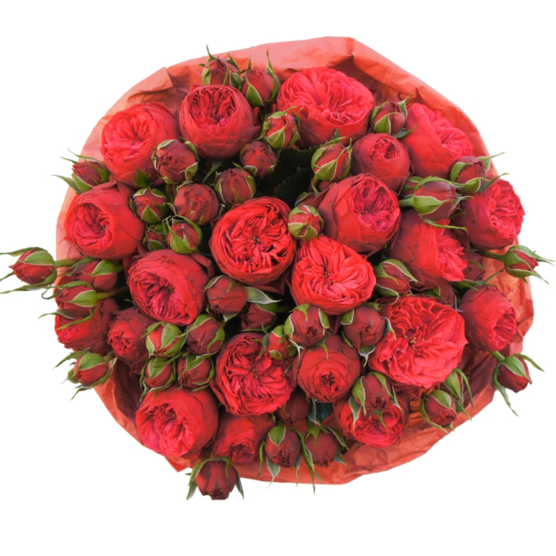 Букет состоит из 21 ветка кустовой розы Red Piano, крафт, атласная лента.