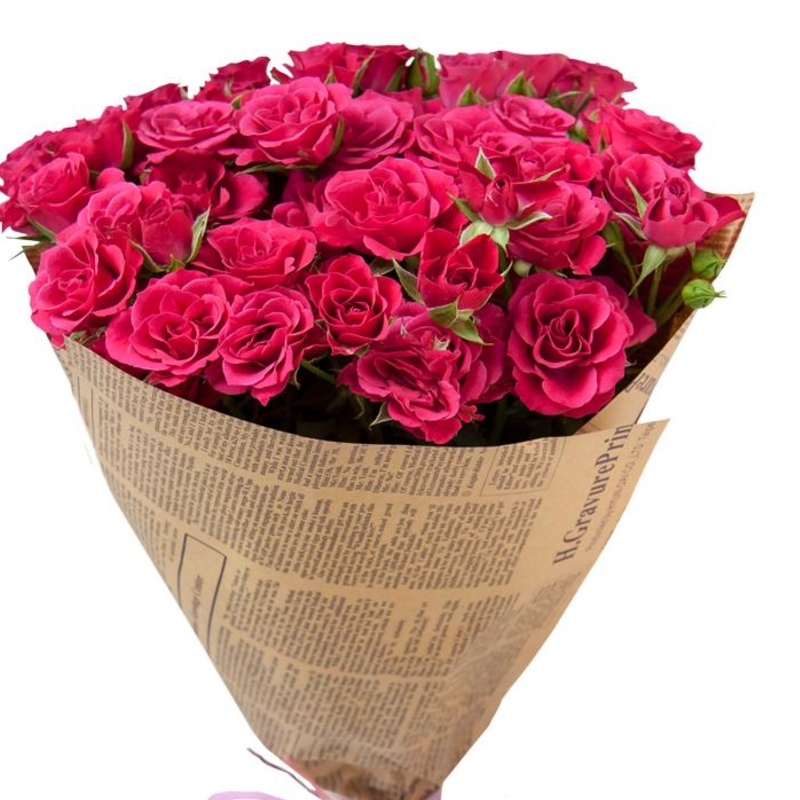 Букет состоит из 17 веток малиновых кустовых роз, крафт, атласная лента.