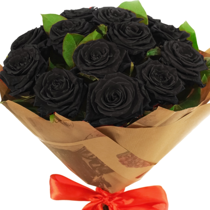 Букет состоит из 13 черных роз, зелень, крафт, атласная лента.