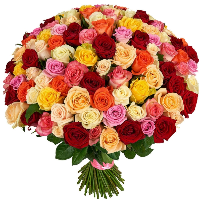 Букет состоит из MIX из 101 розы, прозрачная упаковка, атласная лента.