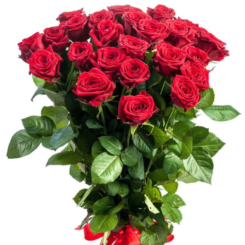 Букет состоит из 25 красных роз, прозрачная упаковка, атласная лента.