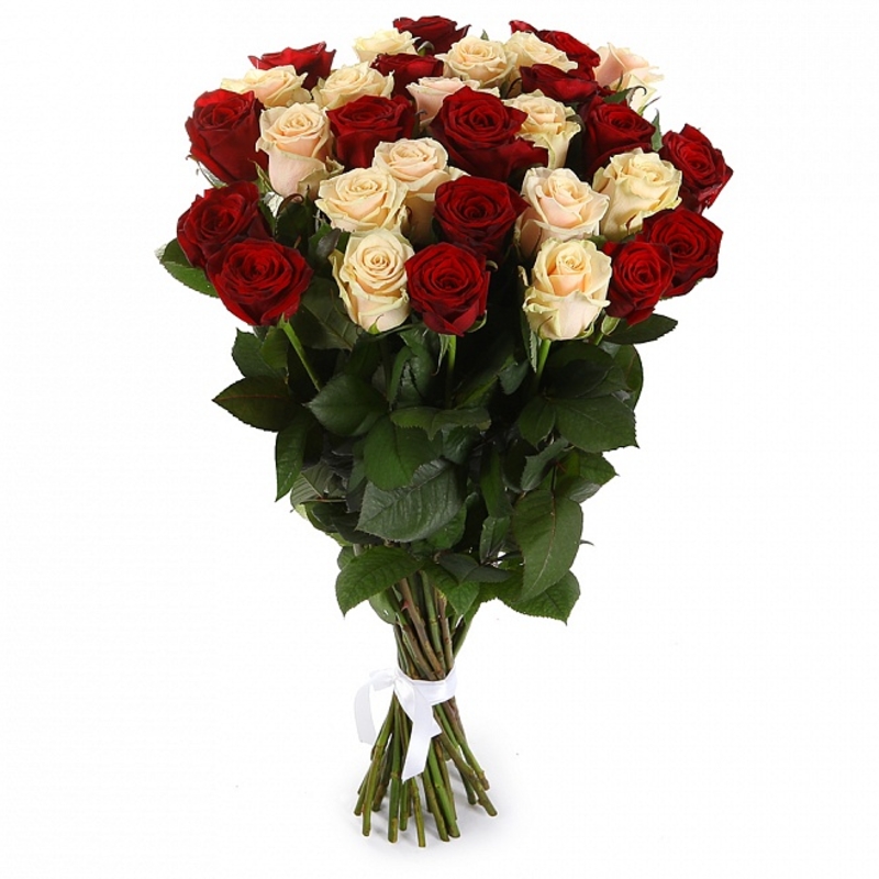 Букет состоит из 16 красных роз, 15 кремовых роз, прозрачная упаковка, атласная лента.