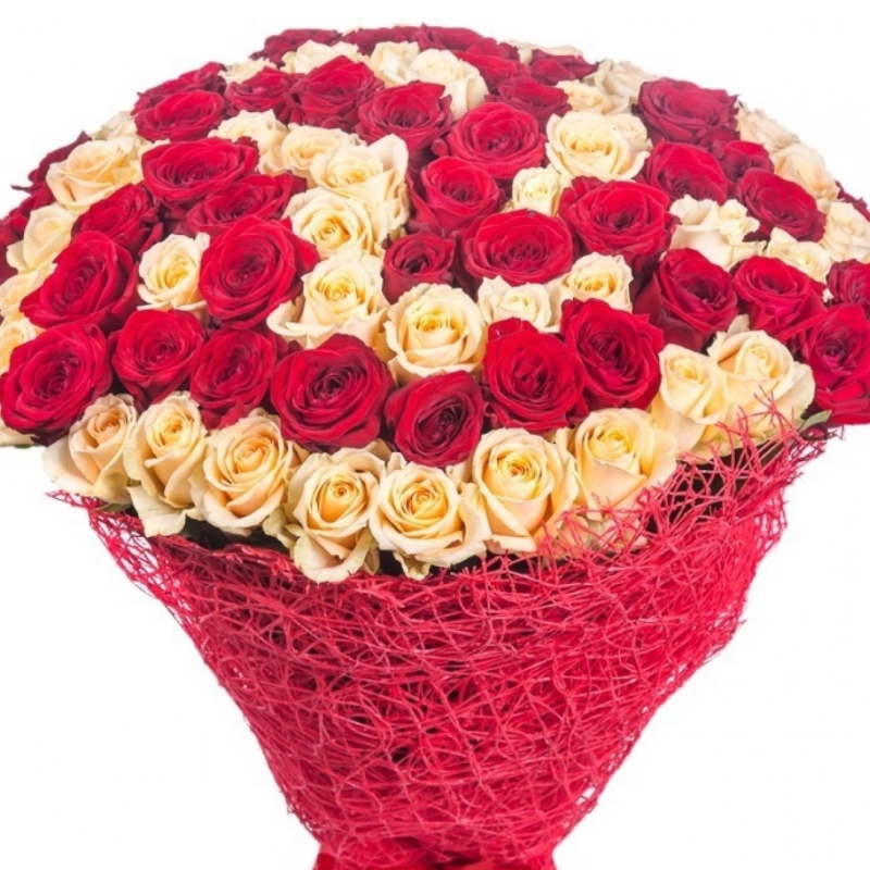 Букет состоит из 51 красная роза, 50 кремовых роз, красивая упаковка, атласная лента.