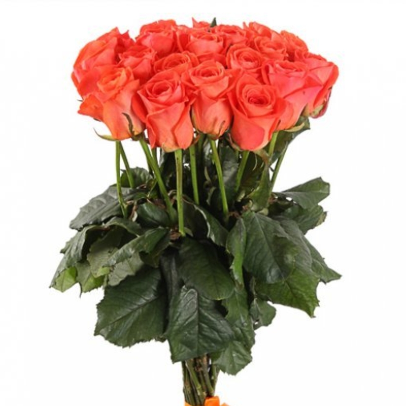Букет состоит из 21 коралловая роза, прозрачная упаковка, атласная лента.