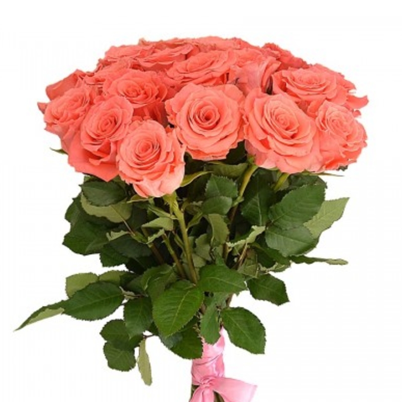 Букет состоит из 25 коралловых роз, прозрачная упаковка, атласная лента.