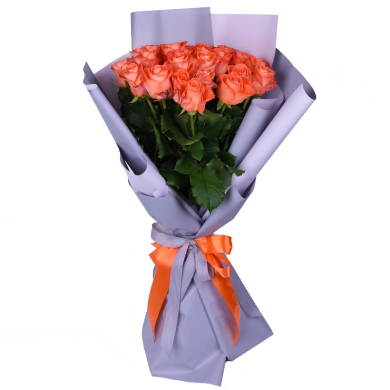 Букет состоит из 19 коралловых роз, красивая упаковка, атласная лента.