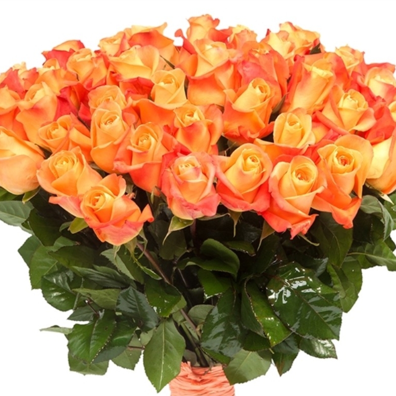 Букет состоит из 75 коралловых роз, прозрачная упаковка, атласная лента.