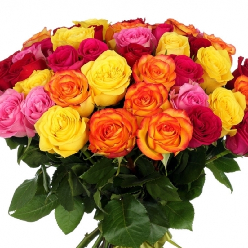 Букет состоит из MIX из 35 роз, прозрачная упаковка, атласная лента.