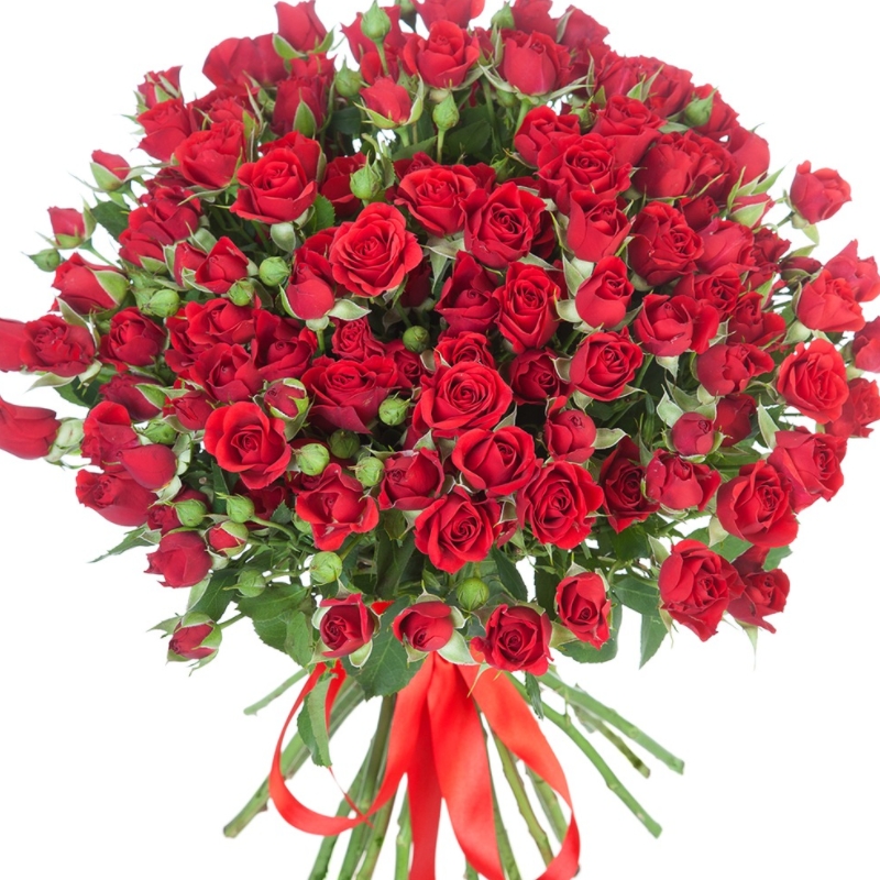 Букет состоит из 17 красных кустовых роз, прозрачная упаковка, атласная лента.