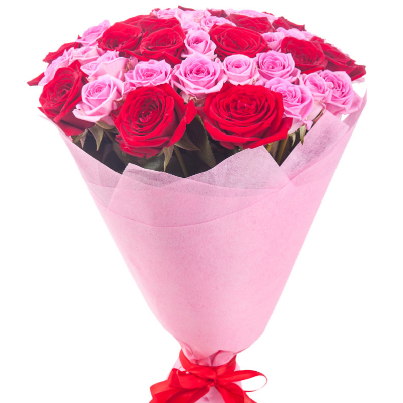 Букет состоит из 23 красные розы, 22 розовые розы, красивая упаковка, атласная лента.