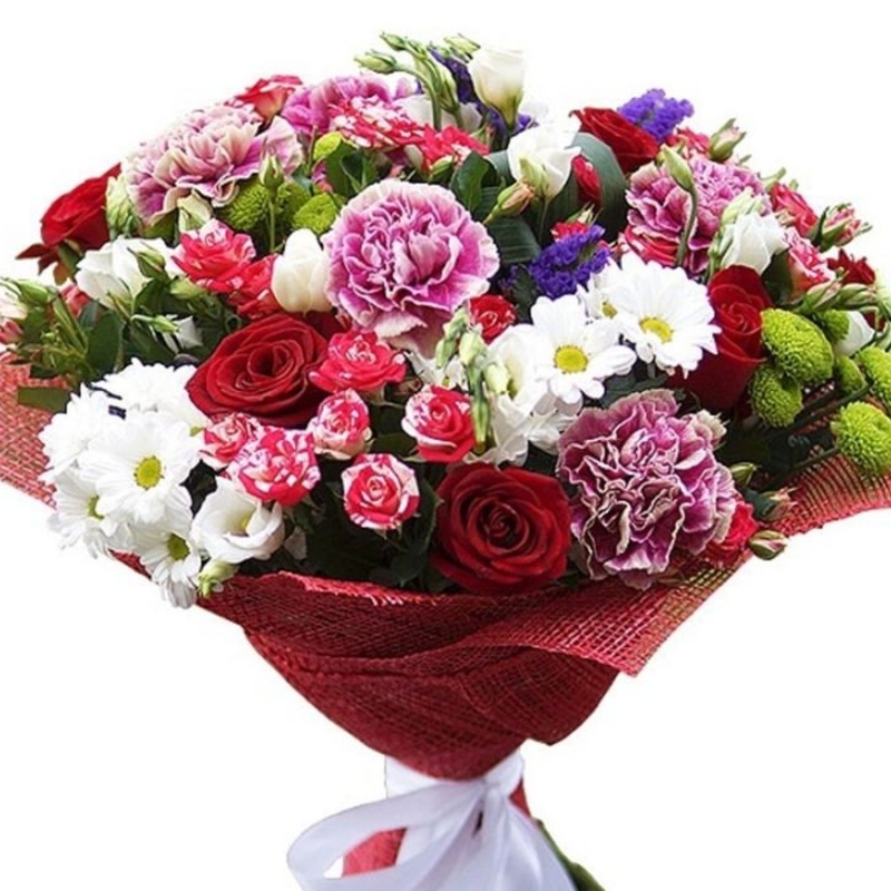 Букет состоит из 5 роз, 5 кустовых роз, 5 гвоздик, 5 веток хризантем, 5 эустом, 2 статица, красивая упаковка, атласная лента.