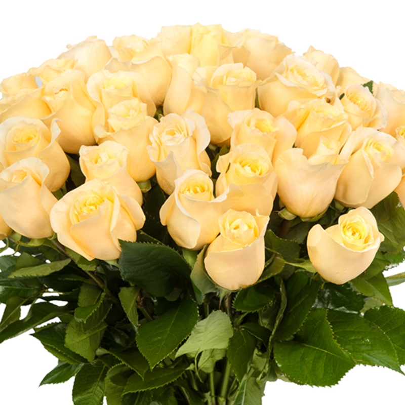 Букет состоит из 45 кремовых роз, прозрачная упаковка, атласная лента.