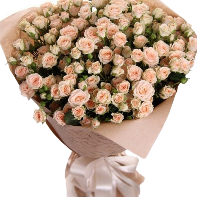Букет состоит из 35 кустовых кремовых роз, крафт, атласная лента.
