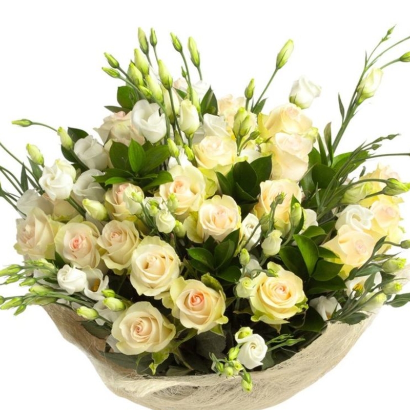 Букет состоит из 7 веток кремовых кустовых роз, 5 веток эустомы, зелень, сизаль, атласная лента.