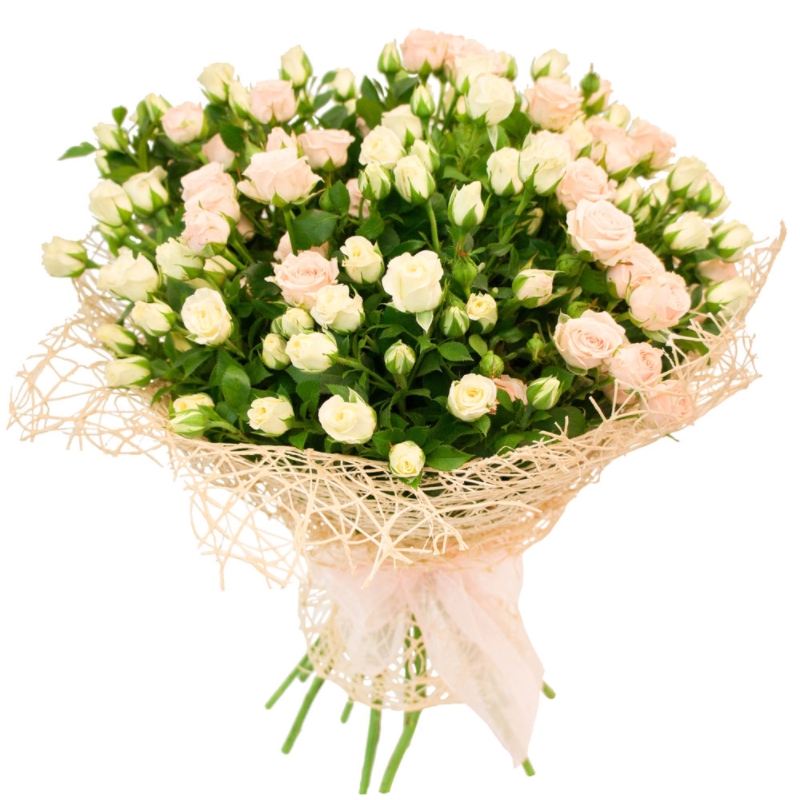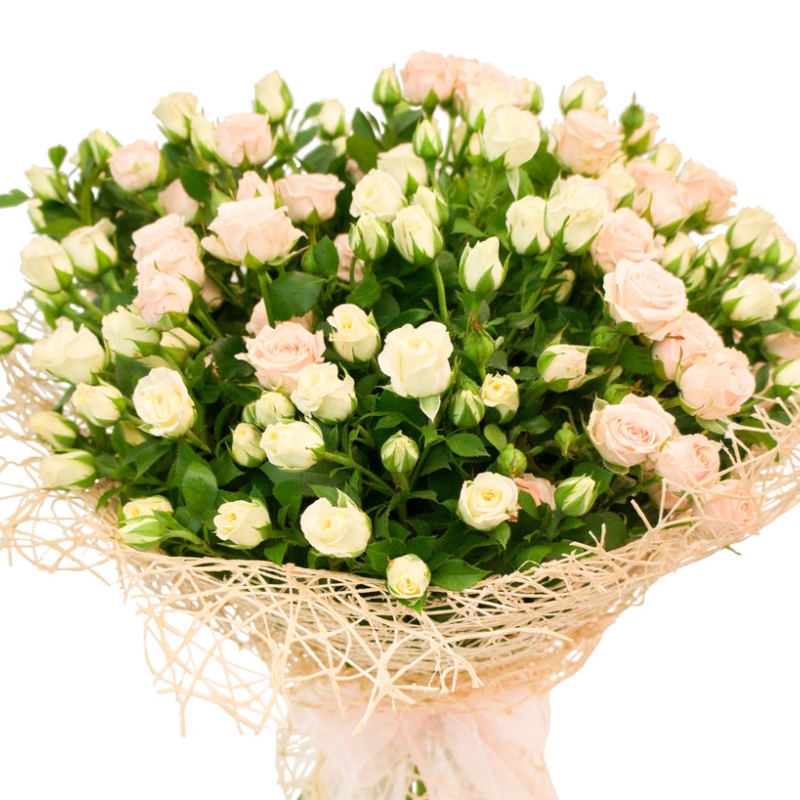 Букет состоит из MIX из 25 белых и кремовых кустовых роз, красивая упаковка, атласная лента.