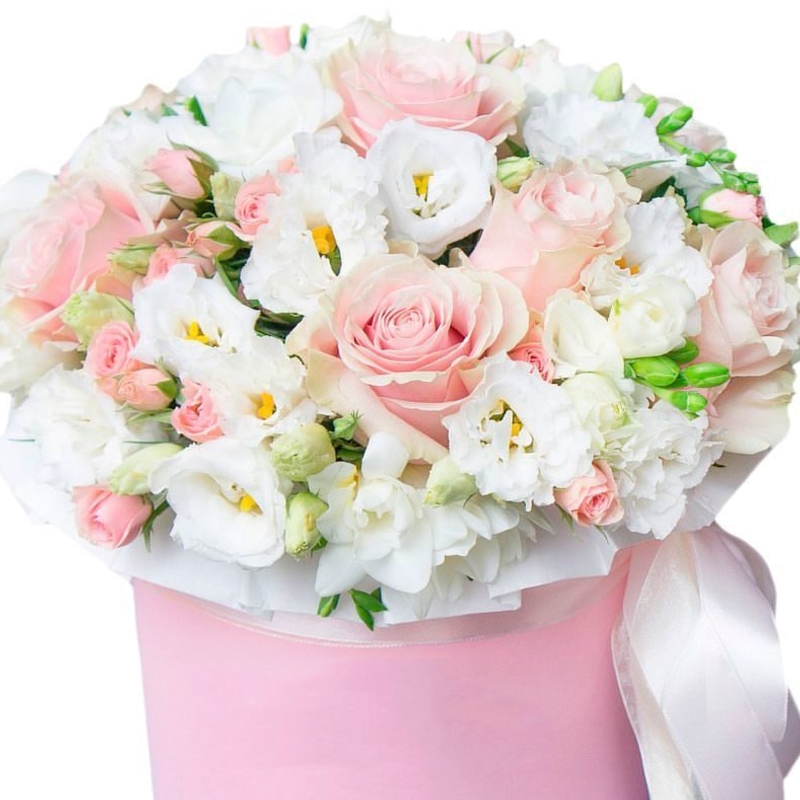 Букет состоит из 9 розовых роз, 5 веток кустовой розы, 9 веток эустомы, коробка, оазис.