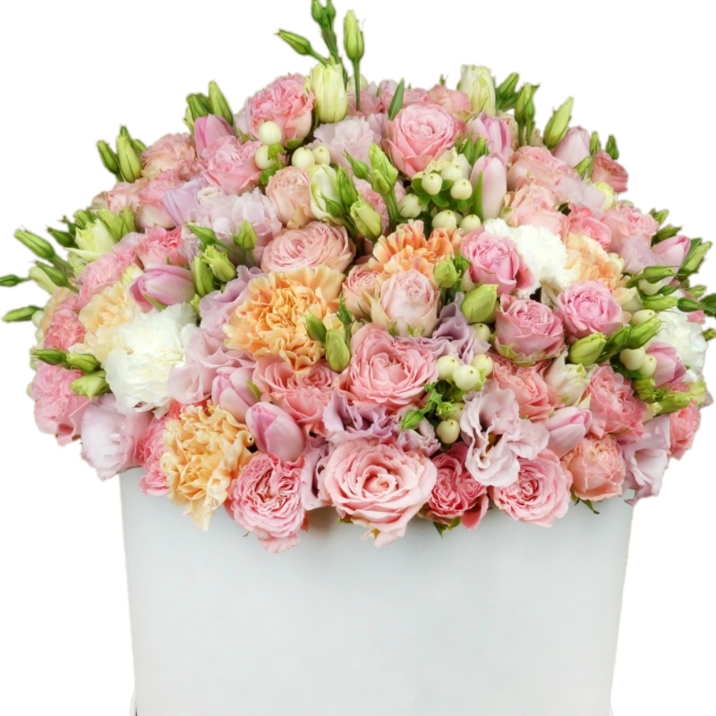 Букет состоит из 10 кустовых пионовидных роз, 8 веток эустомы, 13 гвоздик, 16 тюльпанов, 7 гиперикум, коробка, оазис.