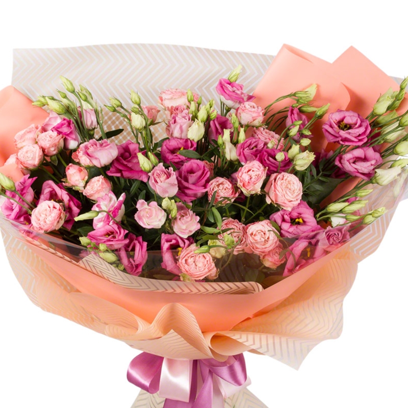 Букет состоит из 5 кустовых роз, 6 веток эустомы, зелень, красивая упаковка, атласная лента.