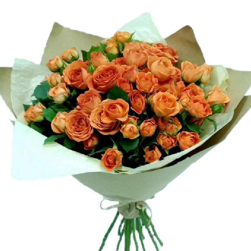 Букет состоит из 15 оранжевых кустовых роз, крафт, атласная лента.