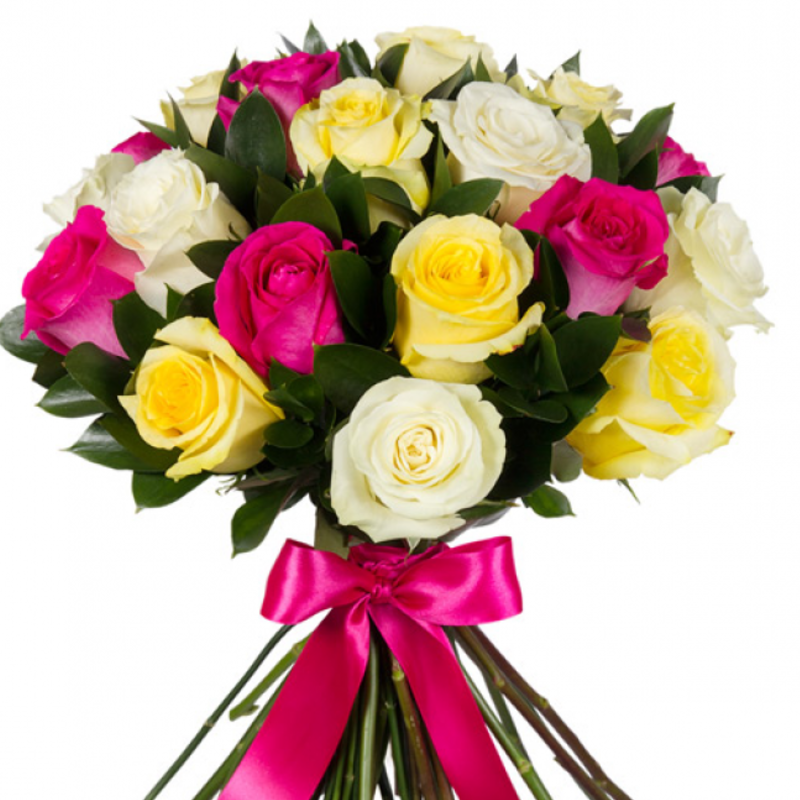 Букет состоит из MIX из 25 роз, зелень, прозрачная упаковка, атласная лента.