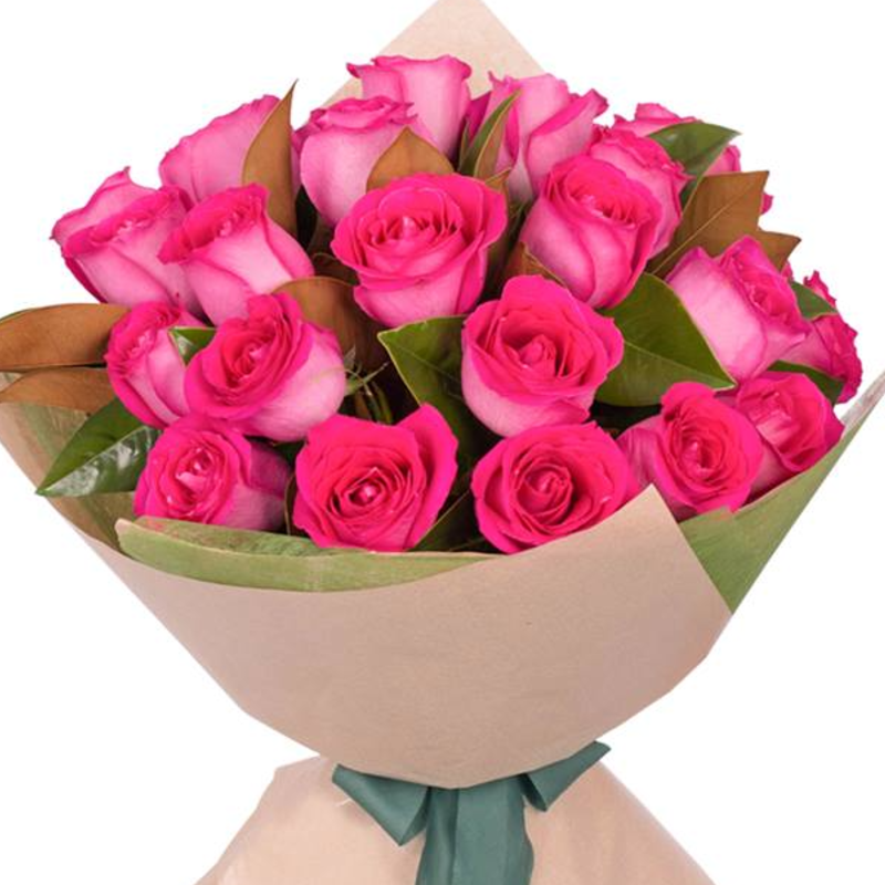 Букет состоит из 21 розовая роза, зелень, крафт, атласная лента.