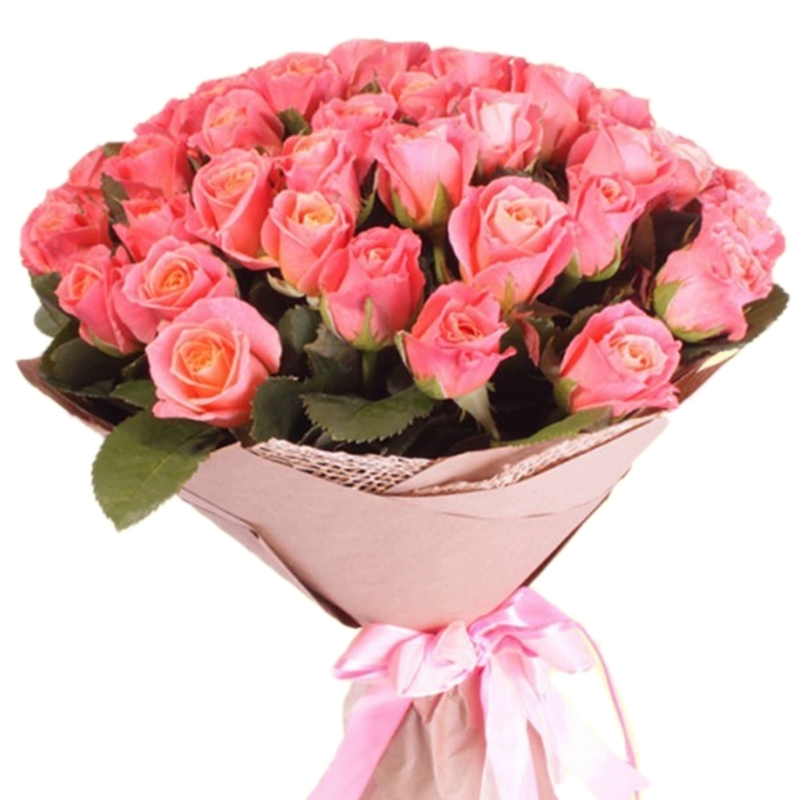 Букет состоит из 45 розовых роз, крафт, атласная лента.