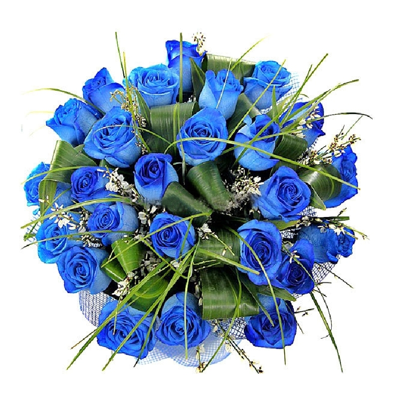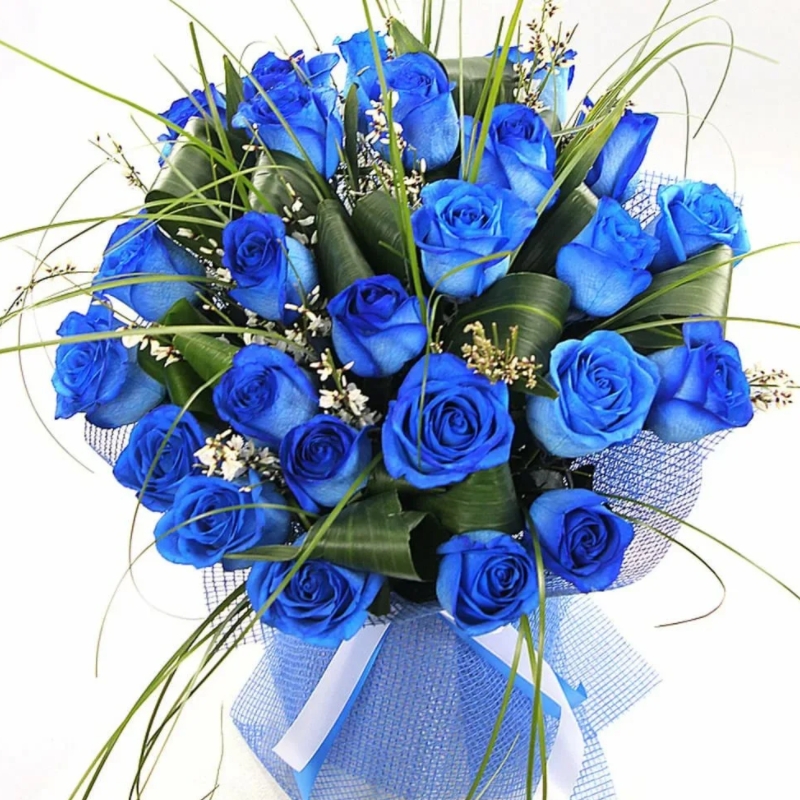 Букет состоит из 25 синих роз, аспидистра, зелень, красивая упаковка, атласная лента.