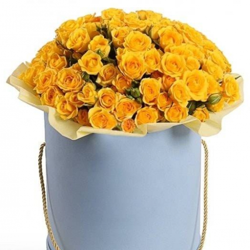 Букет состоит из 19 желтых кустовых роз, коробка, оазис.