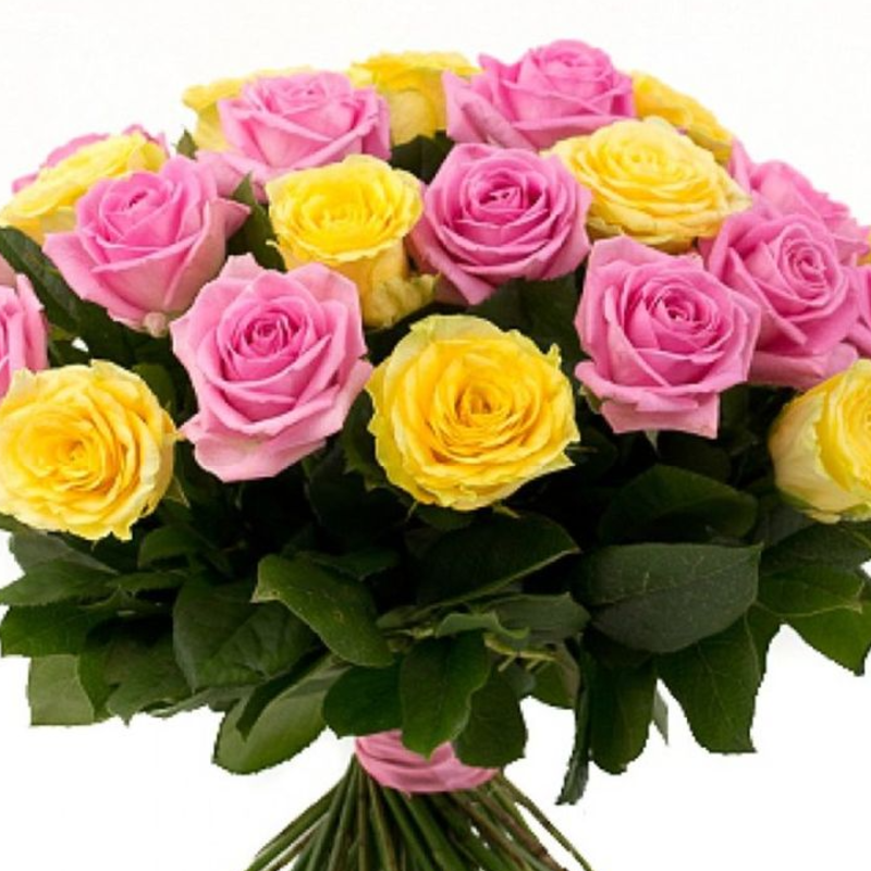 Букет состоит из 23 розовые розы, 22 желтые розы, прозрачная упаковка, атласная лента.