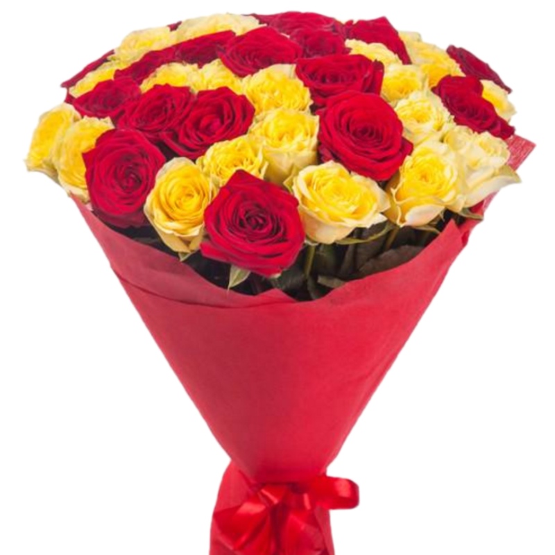 Букет состоит из 23 красные розы, 22 желтые розы, красивая упаковка, атласная лента.