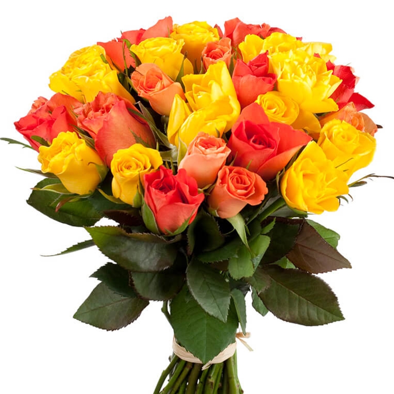 Букет состоит из 23 коралловые розы, 22 желтые розы, прозрачная упаковка, атласная лента.